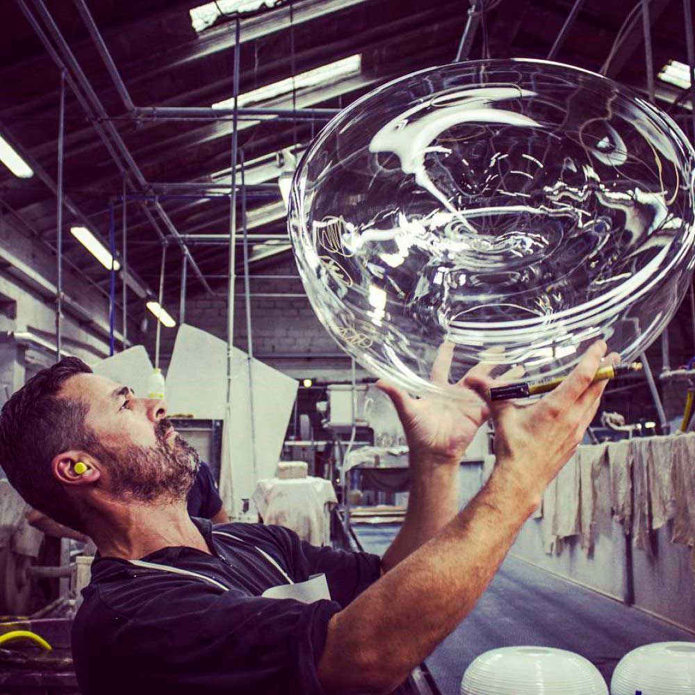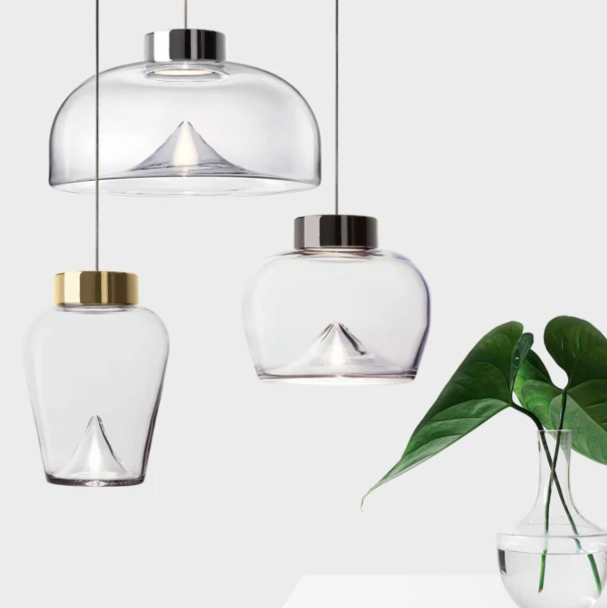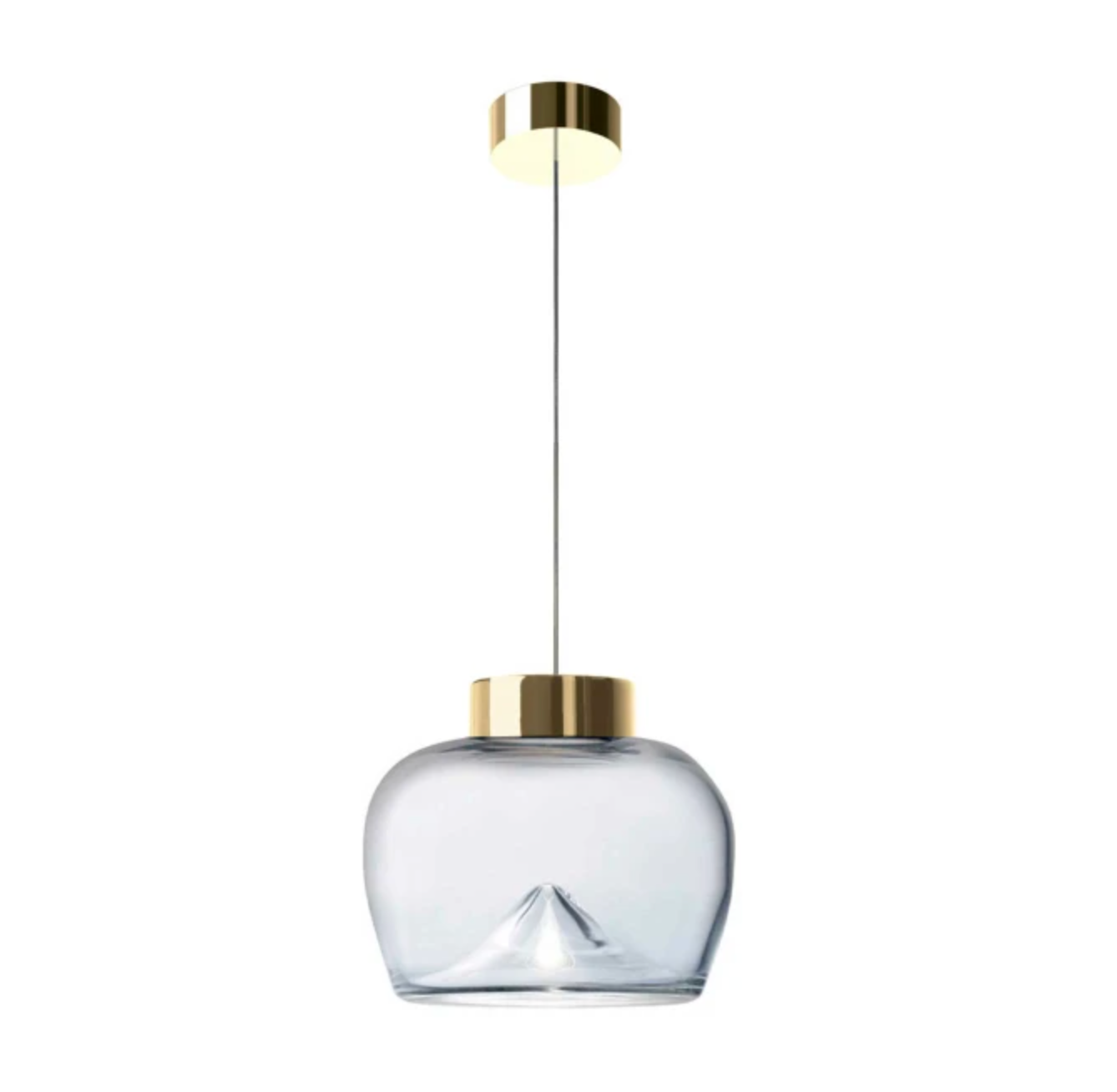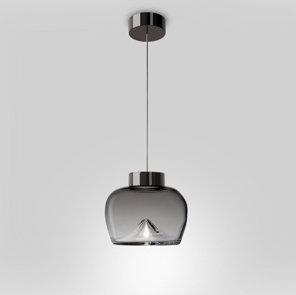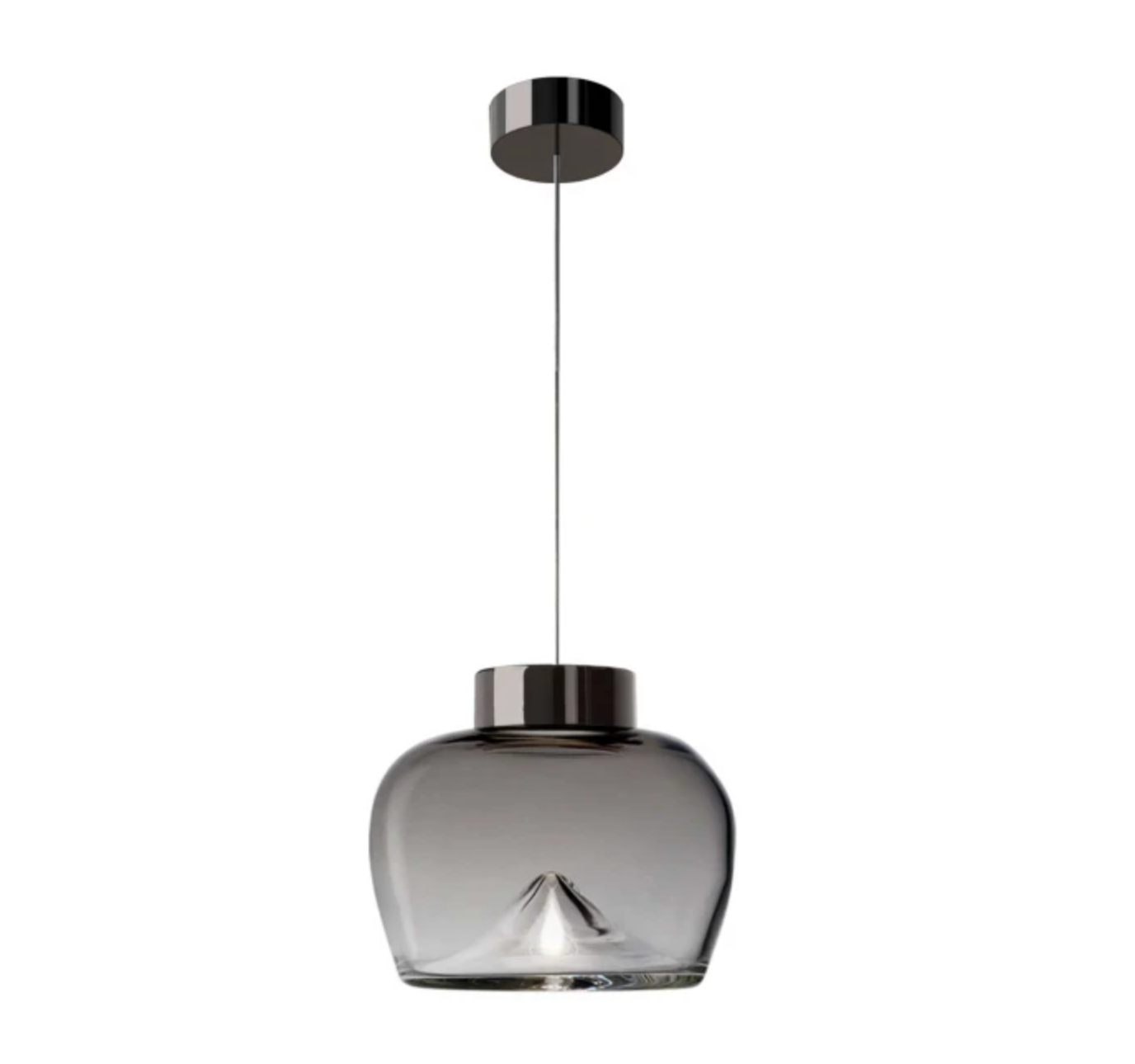 Designerne Toso & Massari har designet denne pendel, der er lavet af mundblæst glas, og fås i enten gunmetal/røget glas, krom/transparent eller guld/transparent.