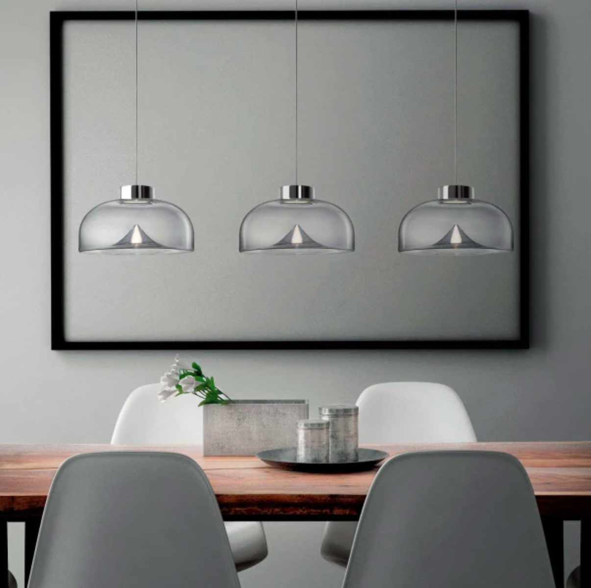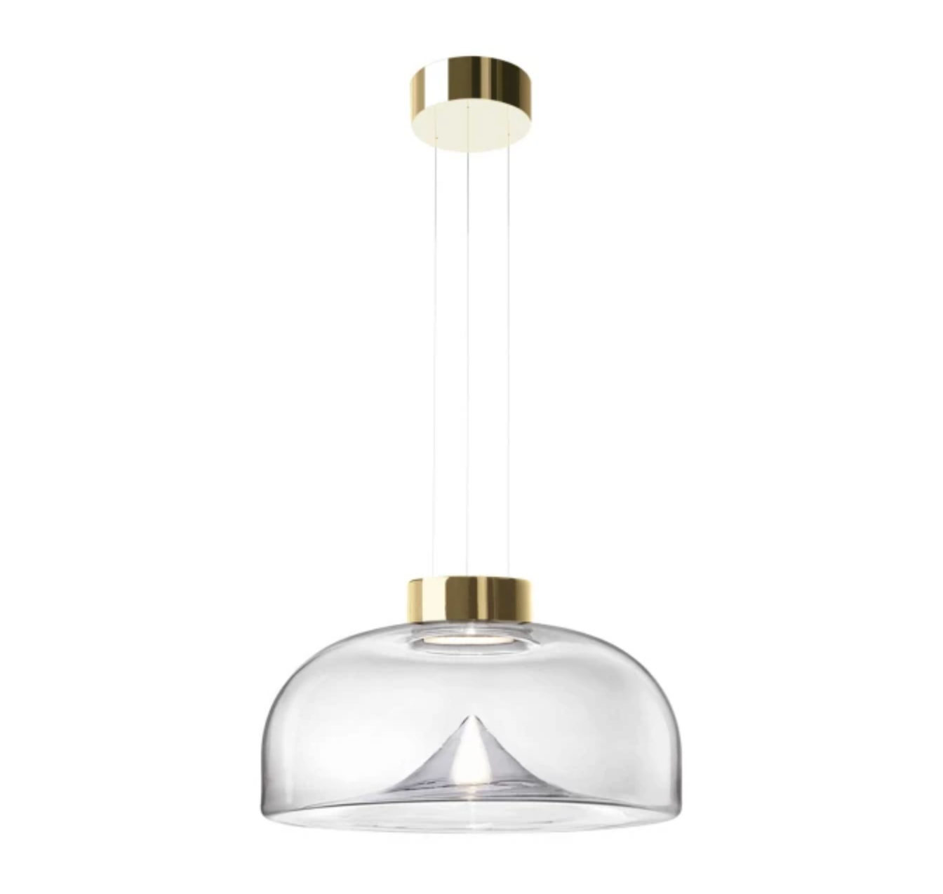 Designerne Toso & Massari har designet denne pendel, som er mundblæst, og fås i enten gunmetal/røget glas, krom/transparent eller guld/transparent.