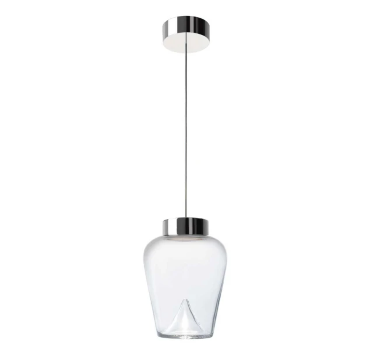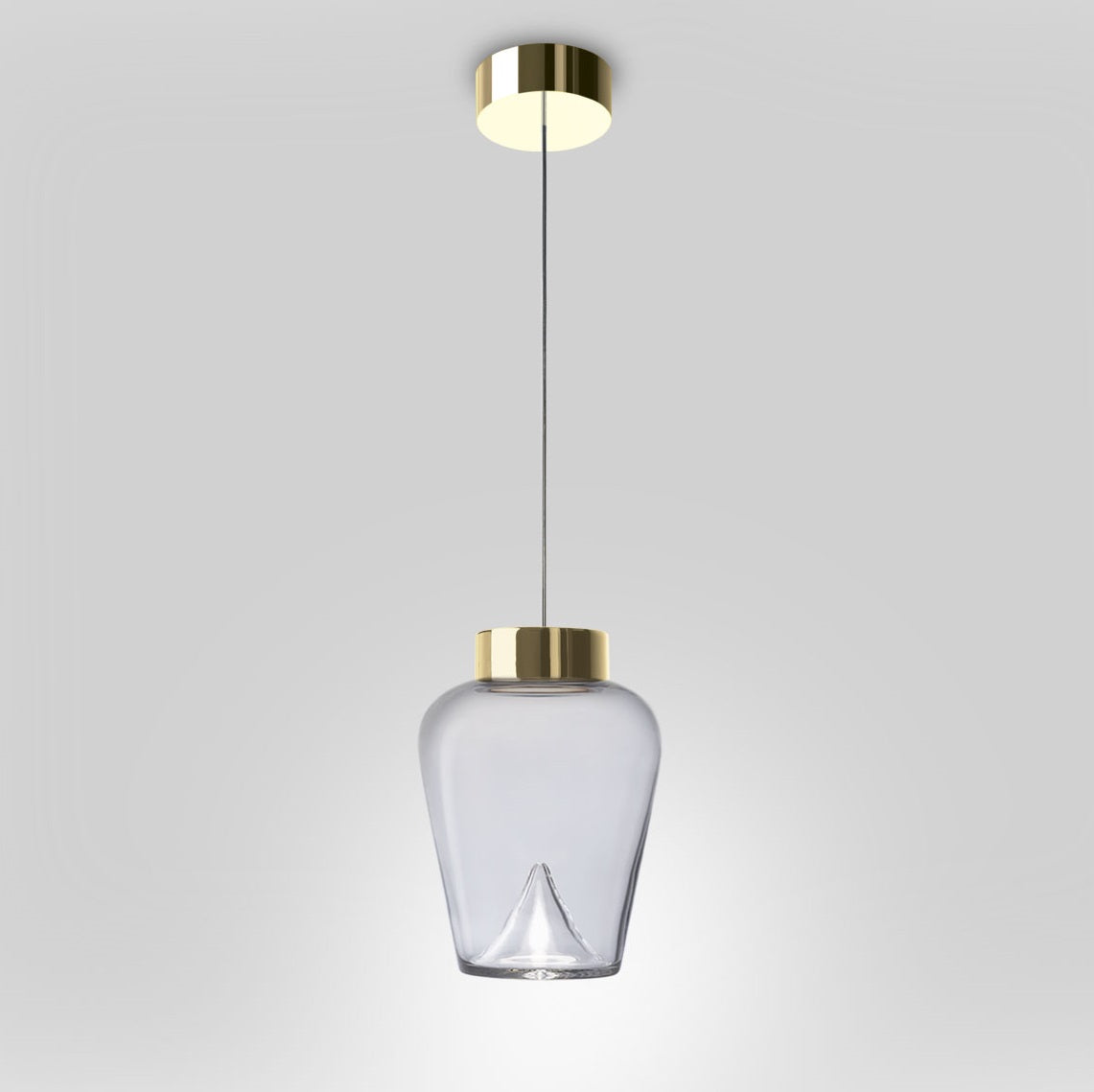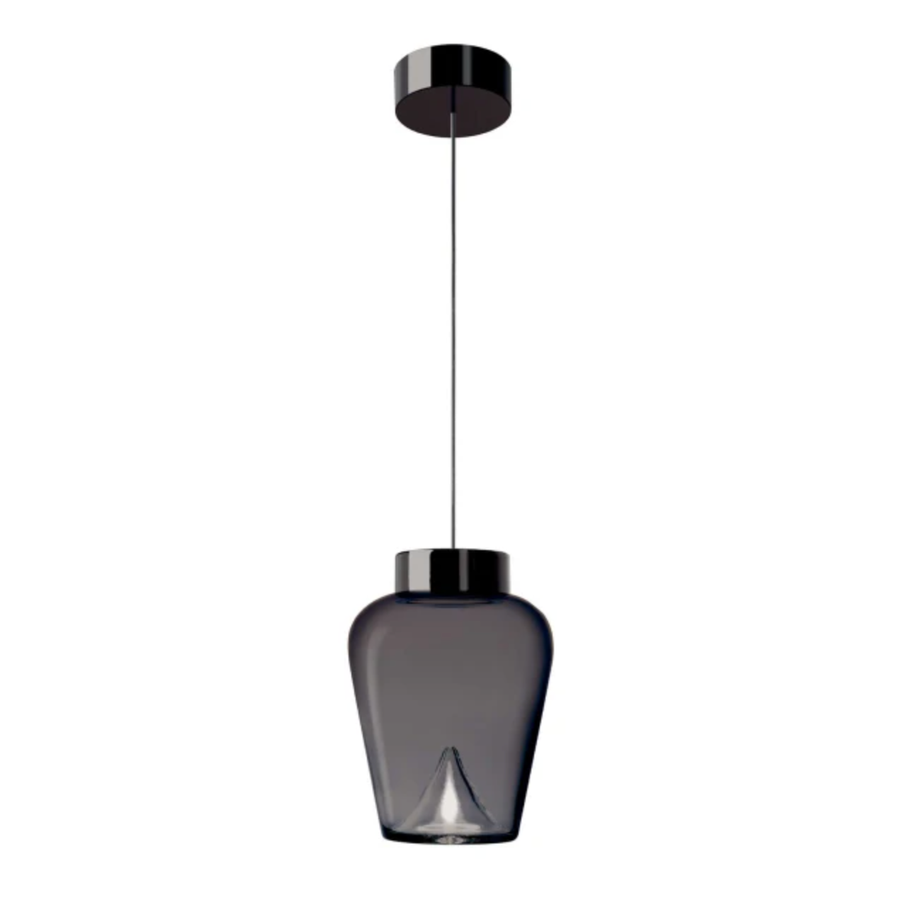 Designerne Toso & Massari har designet denne penden i mundblæst glas, som enten fås i gunmetal/røget, krom/transparent eller guld/transparent.