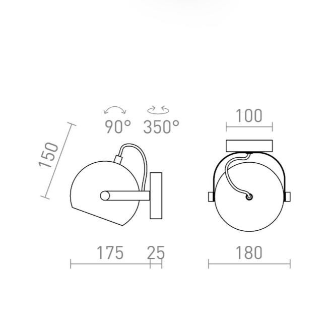 En væglampe med hoved som kan dreje og kippe.