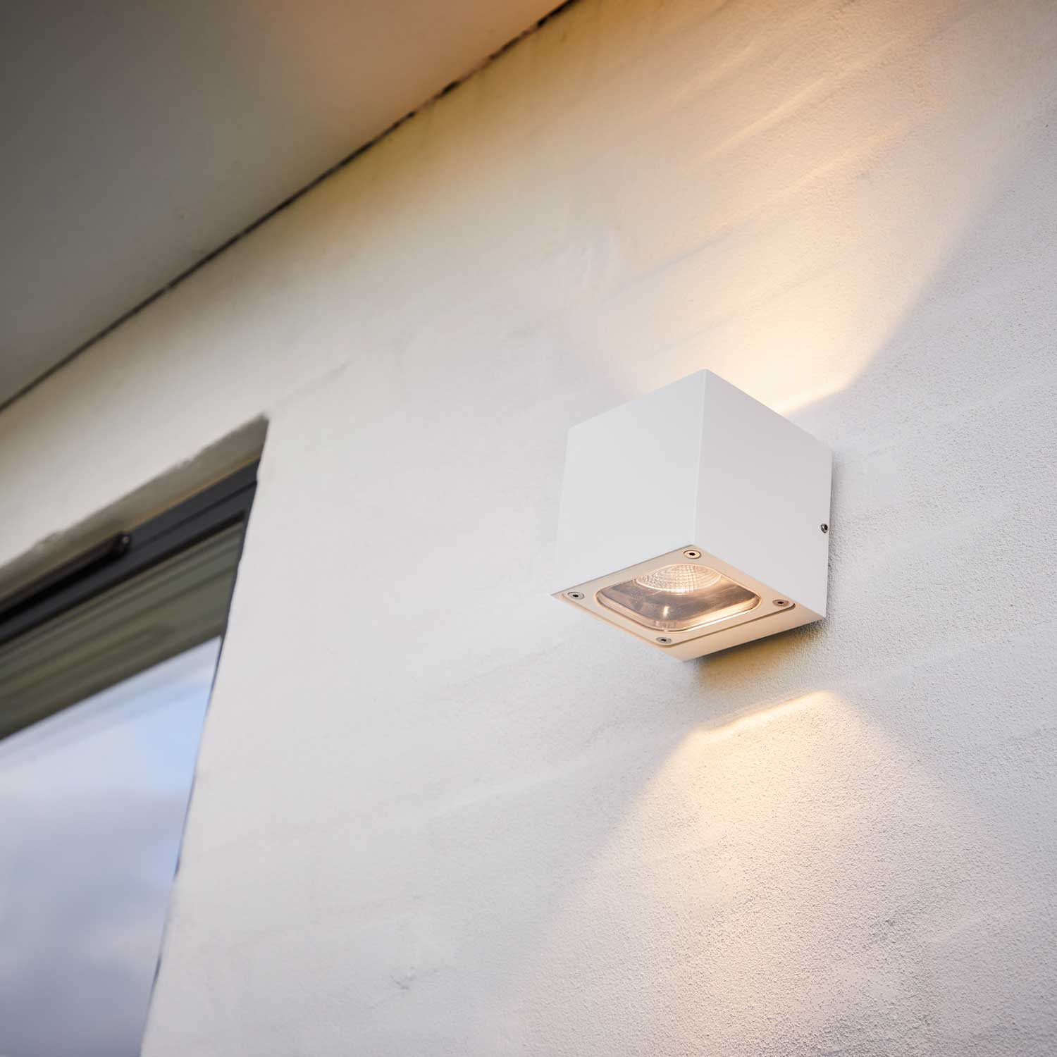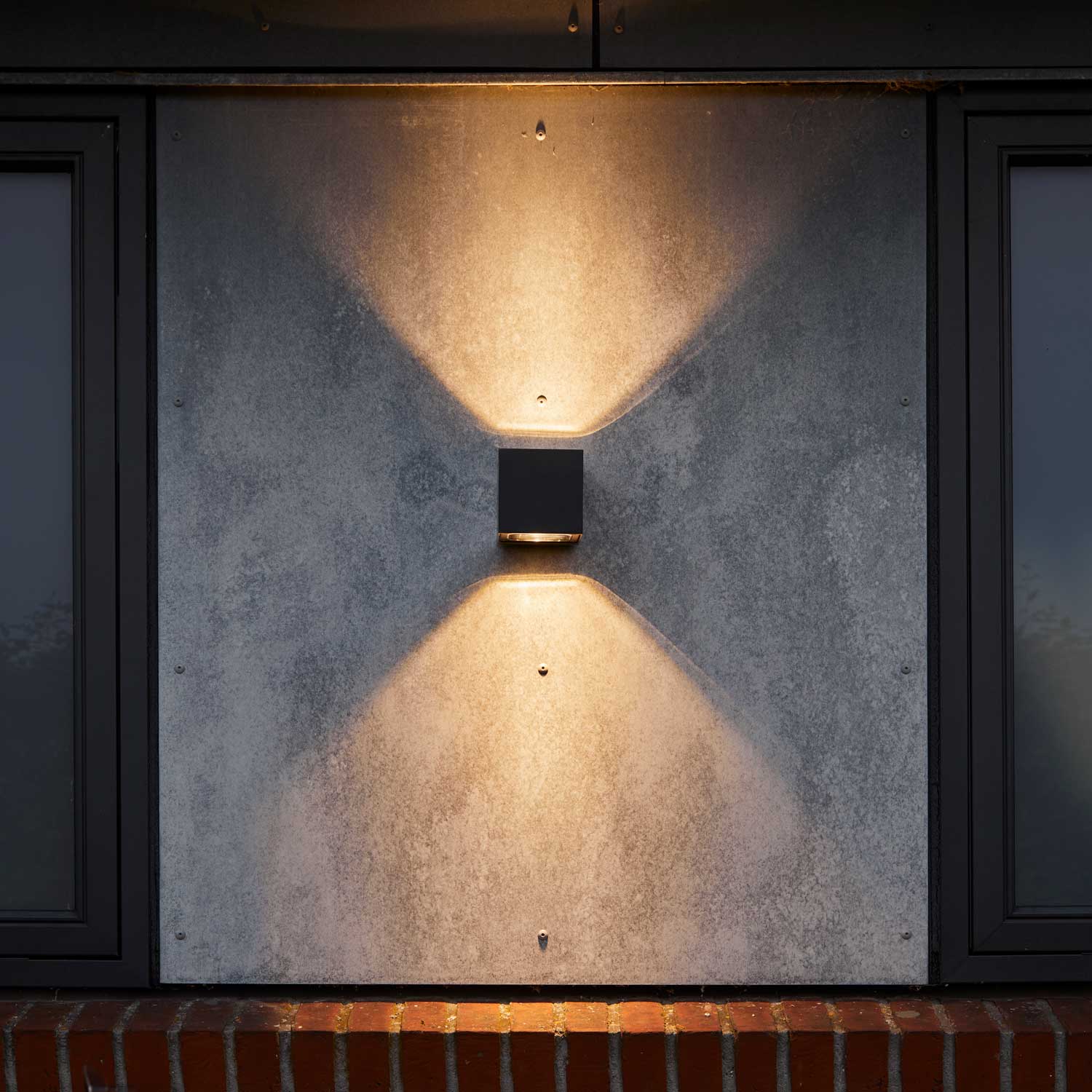 Væglampen udsender en opad- og nedadrettet belysning på 80°, dette giver et flot lysspil på væggen, om end det er ved indgangspartiet eller som general facadebelysning.