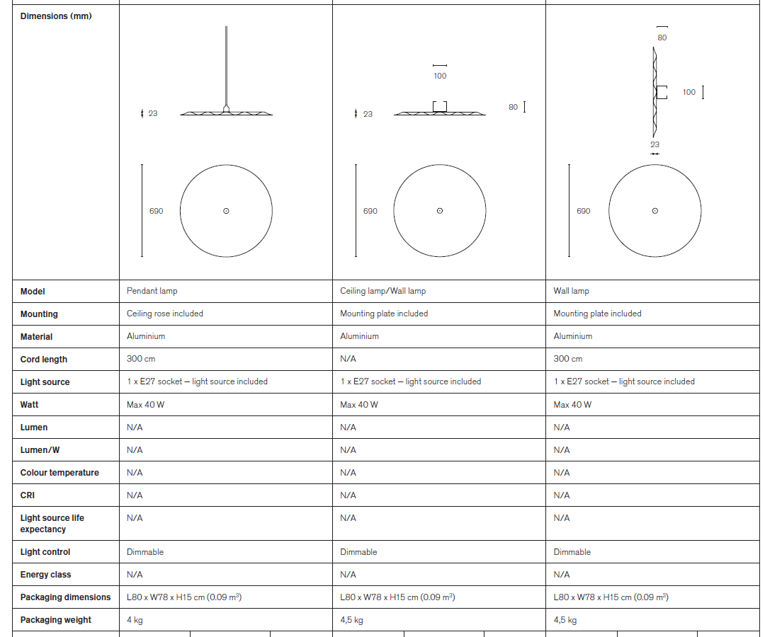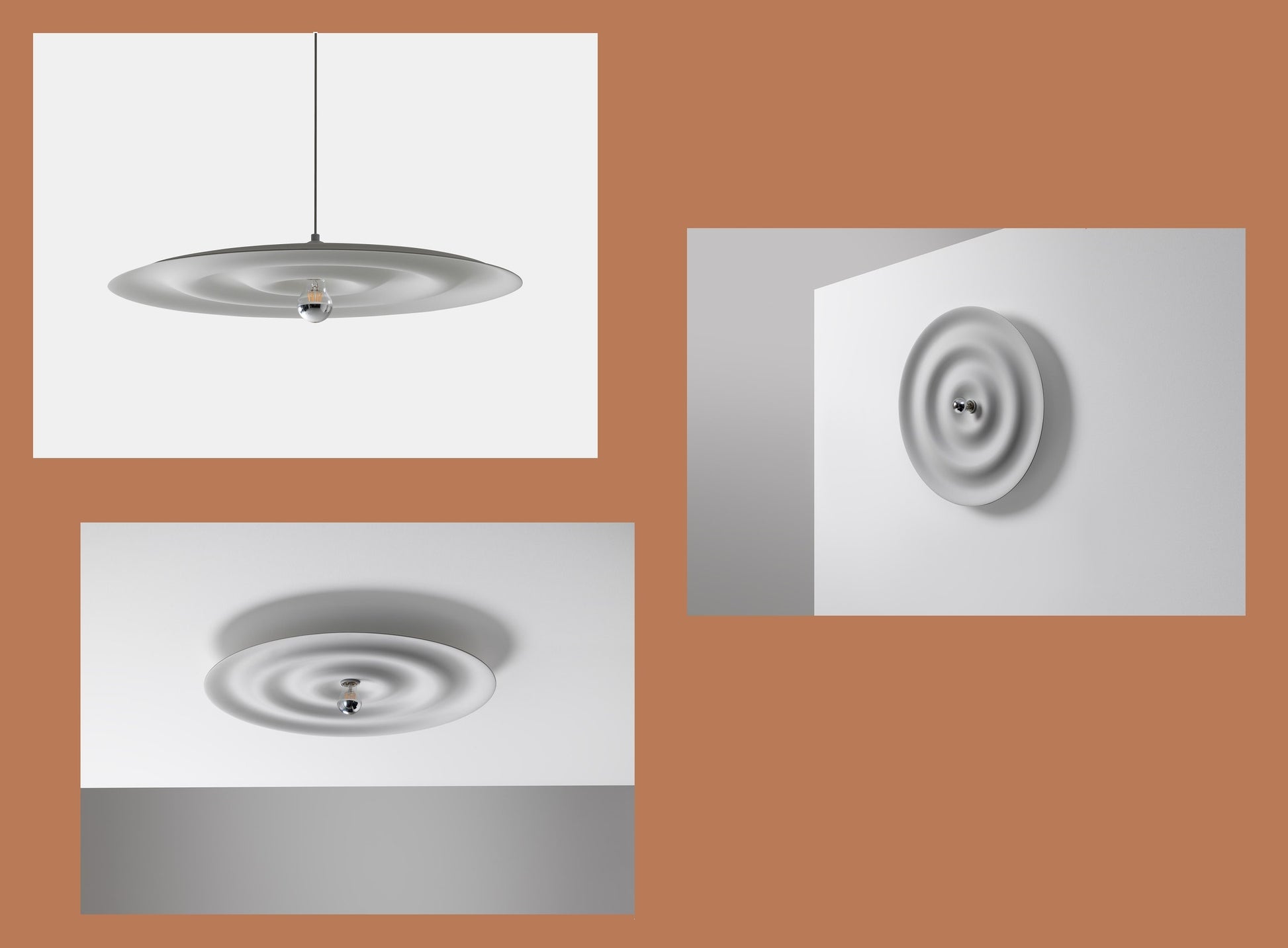 w171 alma- lampen kan monteres direkte på loftet, væggen eller hænge frit som en pendel. Eller som en væglampe med ledning med lysdæmper på.