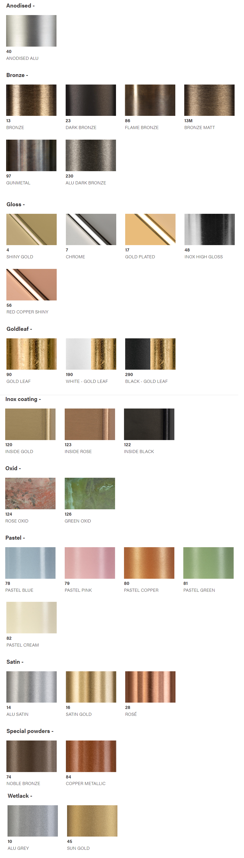 Standard farver: hvid - sort - antrasite - messing - rustfrit stål - lakeret rustfrit stål - grøn - krom- metal grå - sort krom - bronze -alu satin - børstet messing.