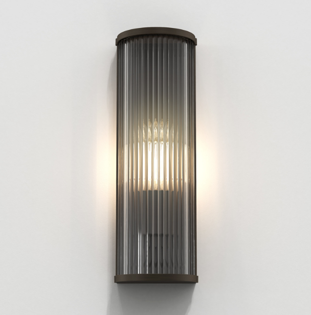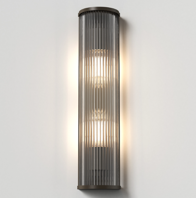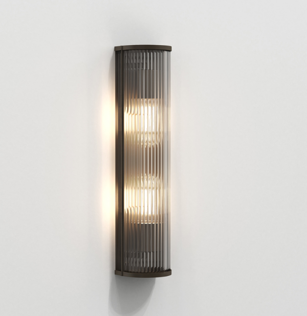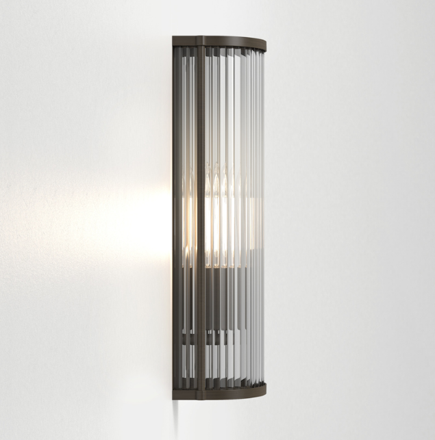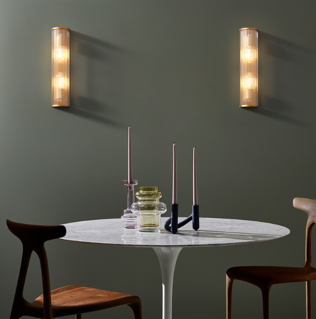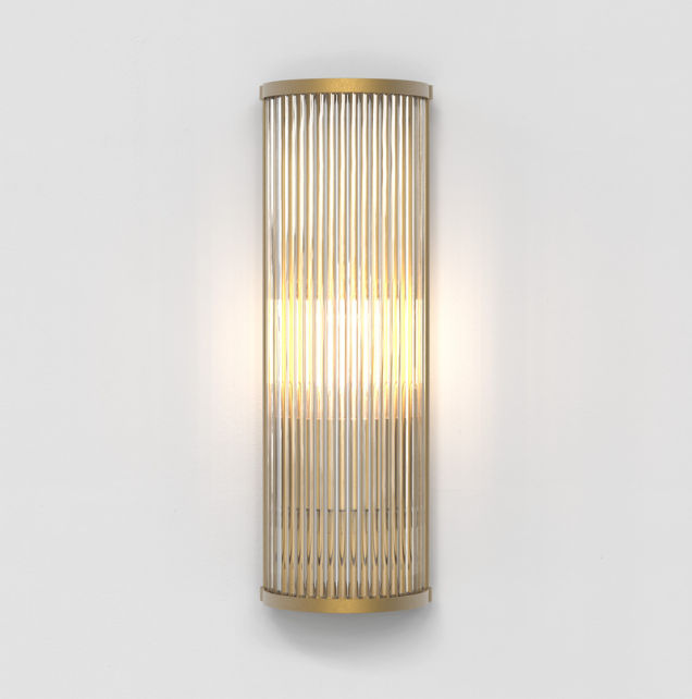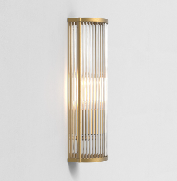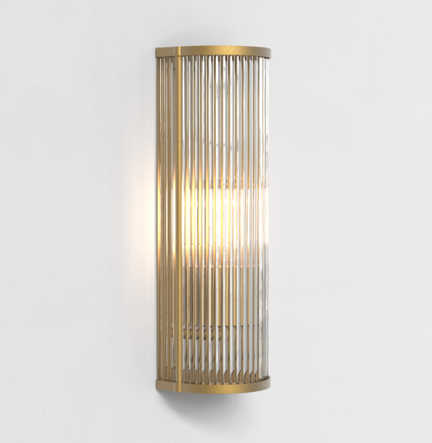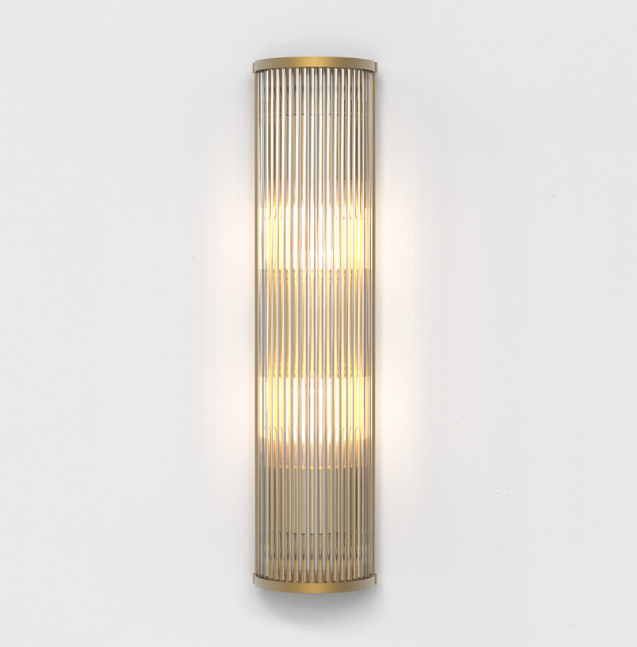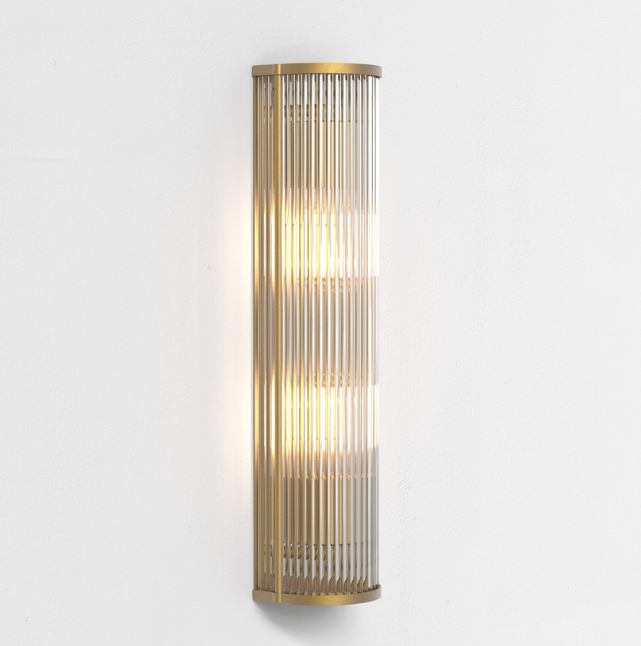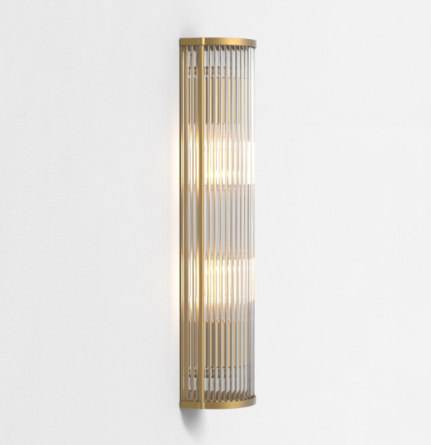 Væglampen er høj og slank med en afrundet profil, den har funklende klare glasstænger, trykstøbte antikke messing-endestykker og udstråler omgivende, blændfri belysning.