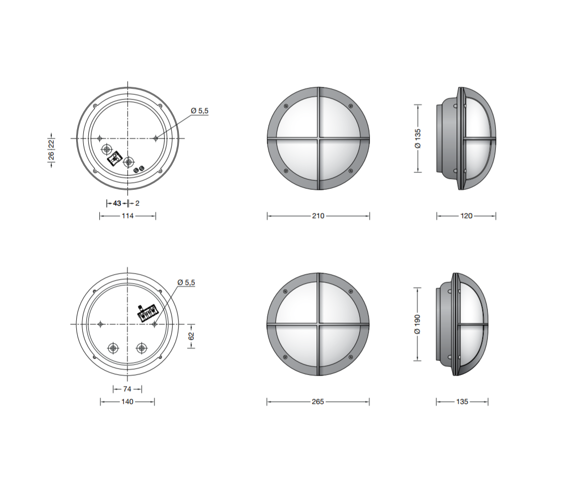 1) Dimention: Ø 22 cm Dybde 13 cm, integreret 5W LED, 3000K, 405lm eller E27 max 75W