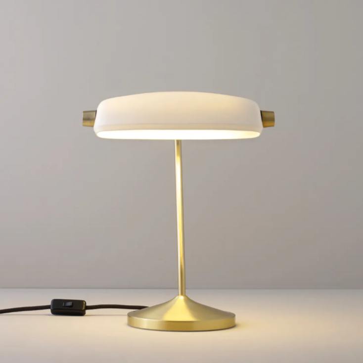 Banker´s bordlampe er en moderned version af originale bank bordlampe med den smukke hvide porcelæns skærm i natur farve, som har en glat og stilren overflade. Kombineret med det børstede messing stel gør den lampen til en tidløs designer bordlampel.