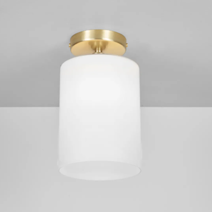 Fås i to versioner messing stel og opal hvidt glas eller antik messing med antracit farvet glas.