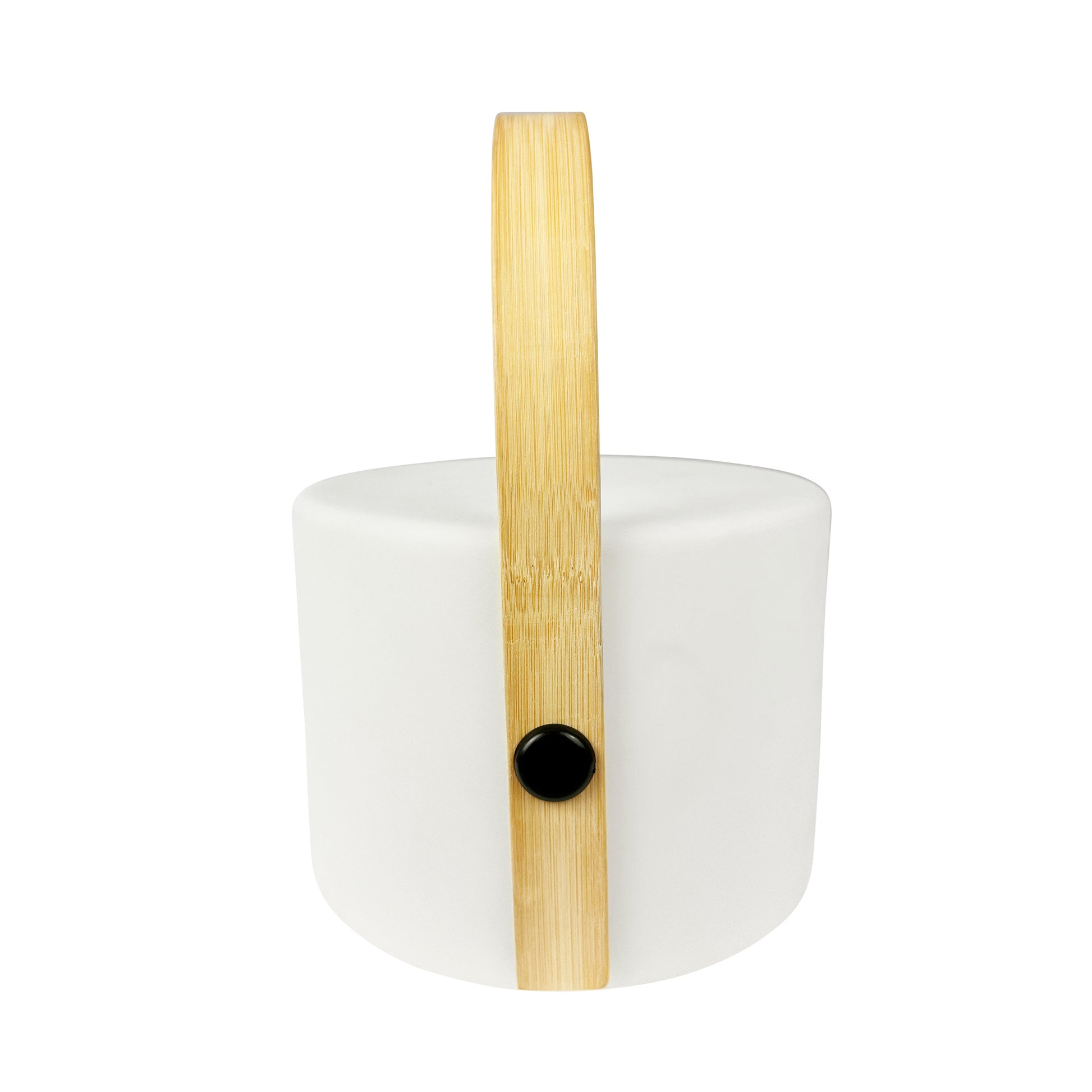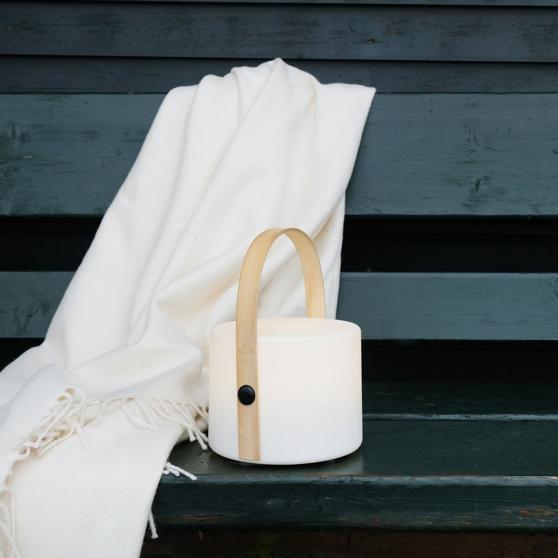 Den flotte hank i bambus, gør lampen praktisk at tage med på farten.