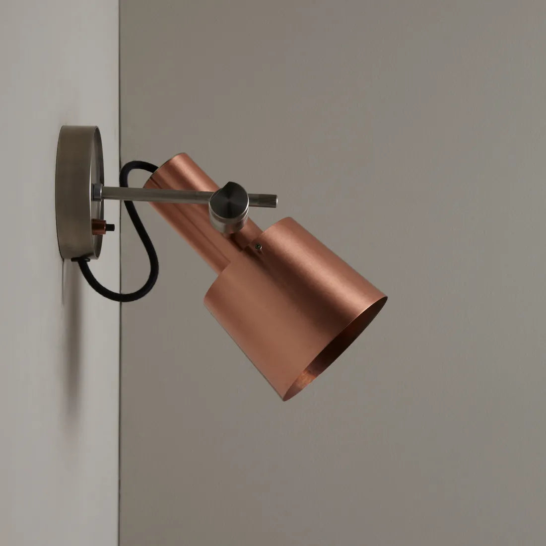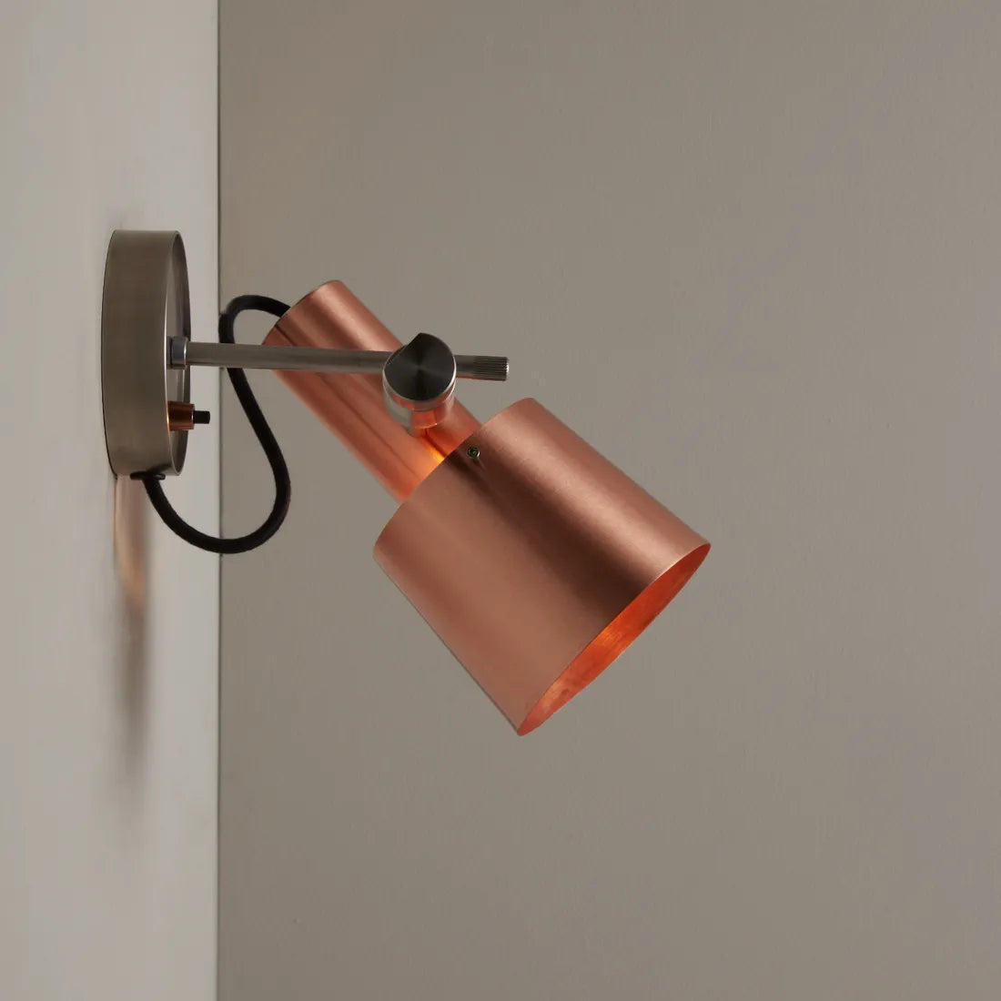 Flotte detaljer og et smukt lampehoved i børstet kobber eller messing sat sammen med rustfrit stål stel.
