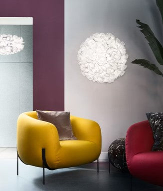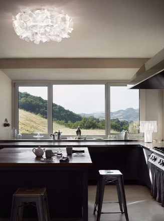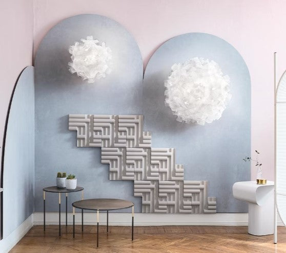 Lamperne har taget form af en sky, der fanger de første lysstråler af morgensolen, eller dansen mellem skygge og lysstråler fra trætoppens blade og mellemrum.