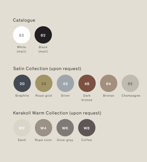 Farve(r): Satin hvid, mat sort, grafit, guld royal, aluminium, mørk bronze, bronze, champagne, sand, mat beige, duegrå eller kaffebrun