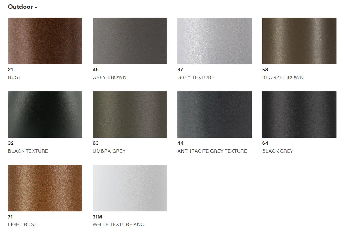 Farver: Messing - Rød kobber - Hvid - Sort - Alu grå - Mat krom - grå brun