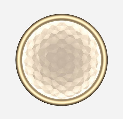 Lyskilden, der er skjult i den cirkulære ramme, reflekteres på den facetslebne overflade indeni.
