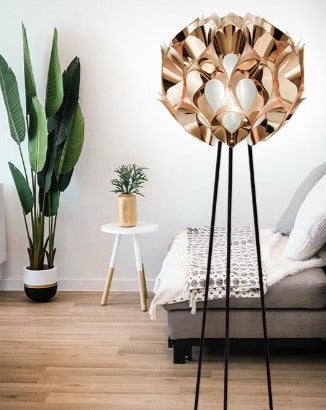 Flora gulvlampe fås i følgende farver: Hvid, sort, kobber, sølv eller guld.