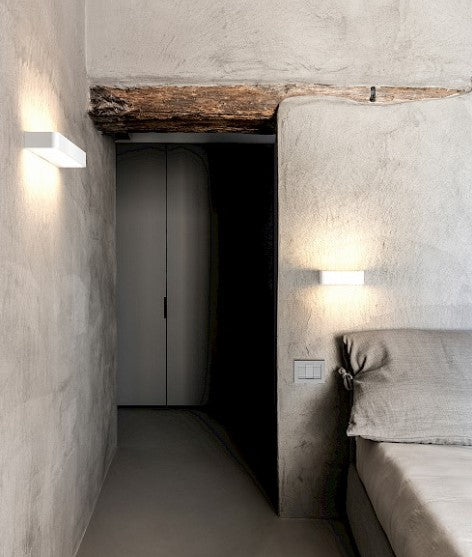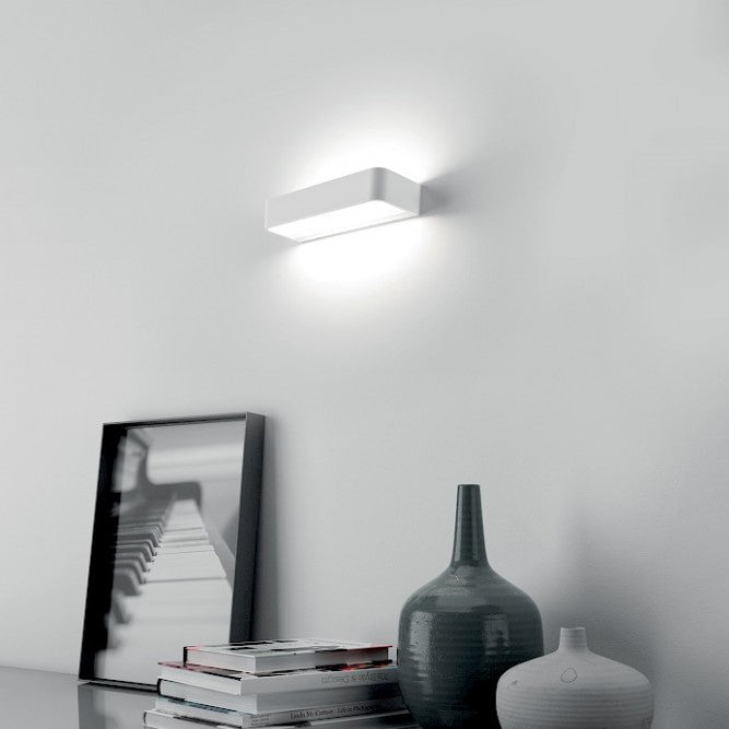 Væglampen består af to ekstruderede aluminiumselementer: Et udvendigt, i form af en ring, og et indvendigt, som tillader symmetrisk spredning af lys, både opad og nedad.