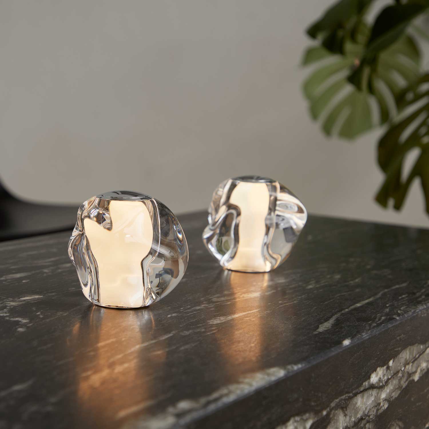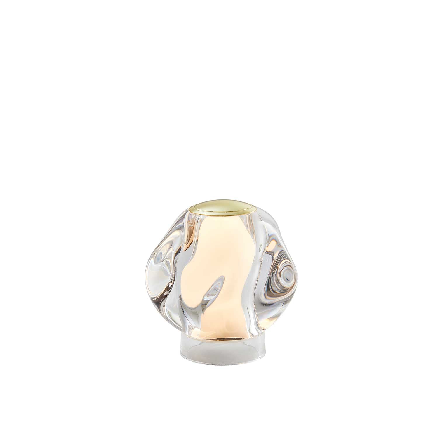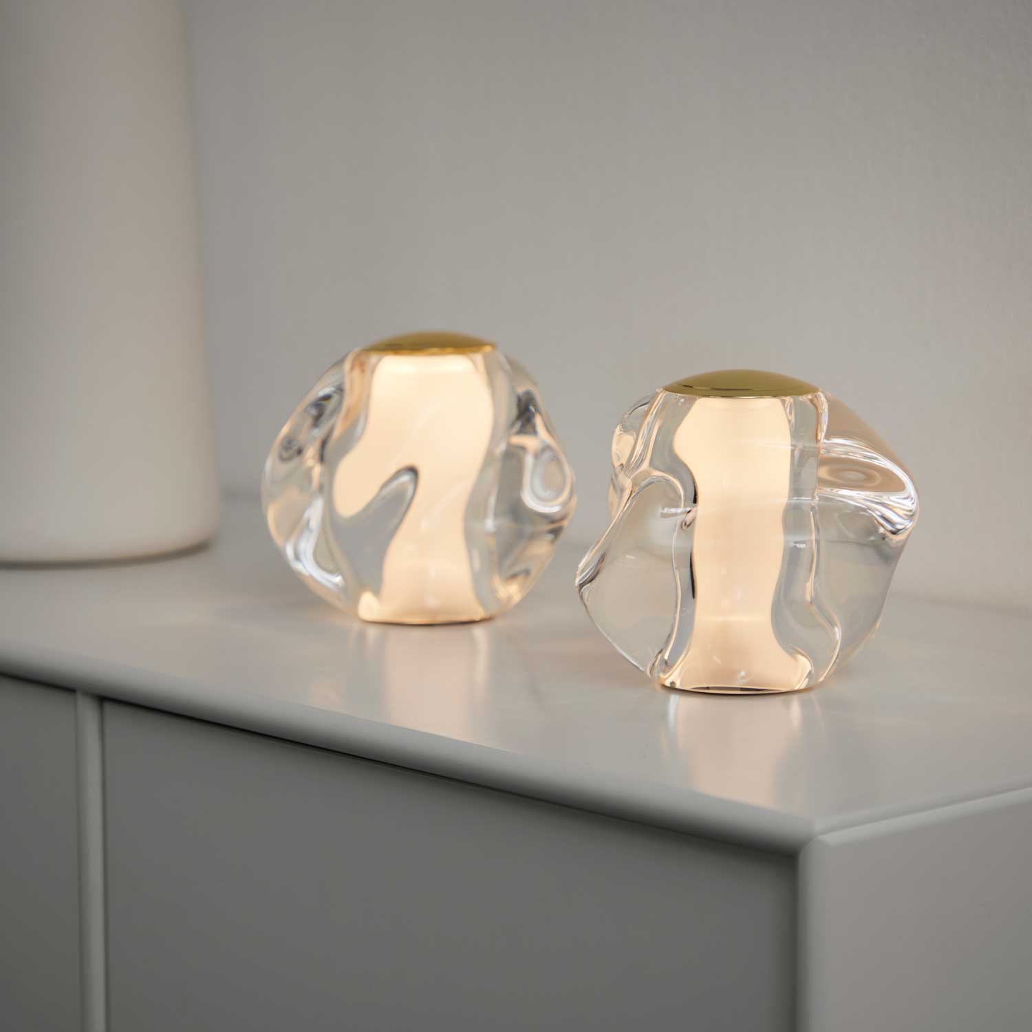 ICE BALL Guld batteridrevet bordlampe repræsenterer en perfekt blanding af funktionalitet og æstetik, indhyllet i et elegant design. Denne lampe fremstår med en organisk formet, klar akrylskærm, der minder om glassets æstetik, hvilket bidrager til et raffineret og sofistikeret udseende. Guldfinishen på toppen tilføjer et luksuriøst præg, som gør lampen til et markant dekorativt element i enhver indretning.
