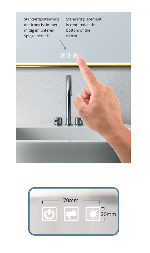 Tilbehør som touch eller håndbevægelses styring med lys og farve/kelvin styring, IP44, stikkontakt, varme i spejlet, skal bestilles på hjemmesiden.
