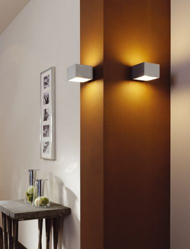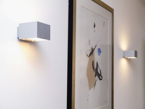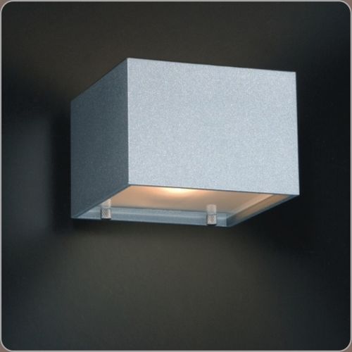 Væglampe der lyser defust op / ned Materet glas i top og bund. Materiale: aluminium Farver: Børstet aluminium - mat sølv - mat guld