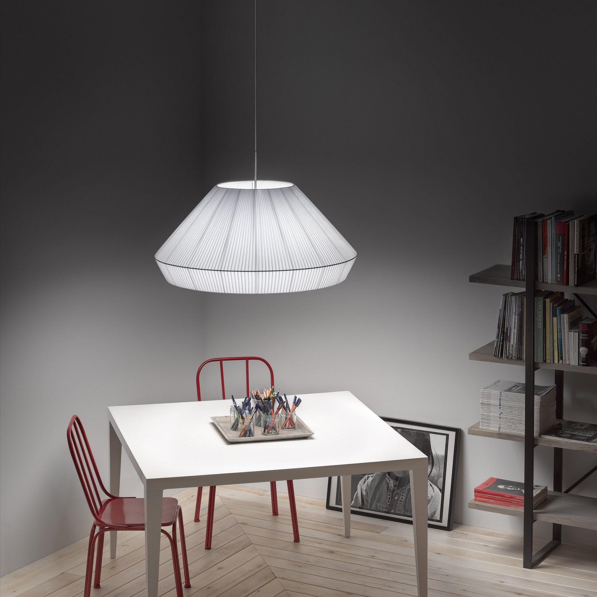 En pendel med tekstil skærm i fire farver.