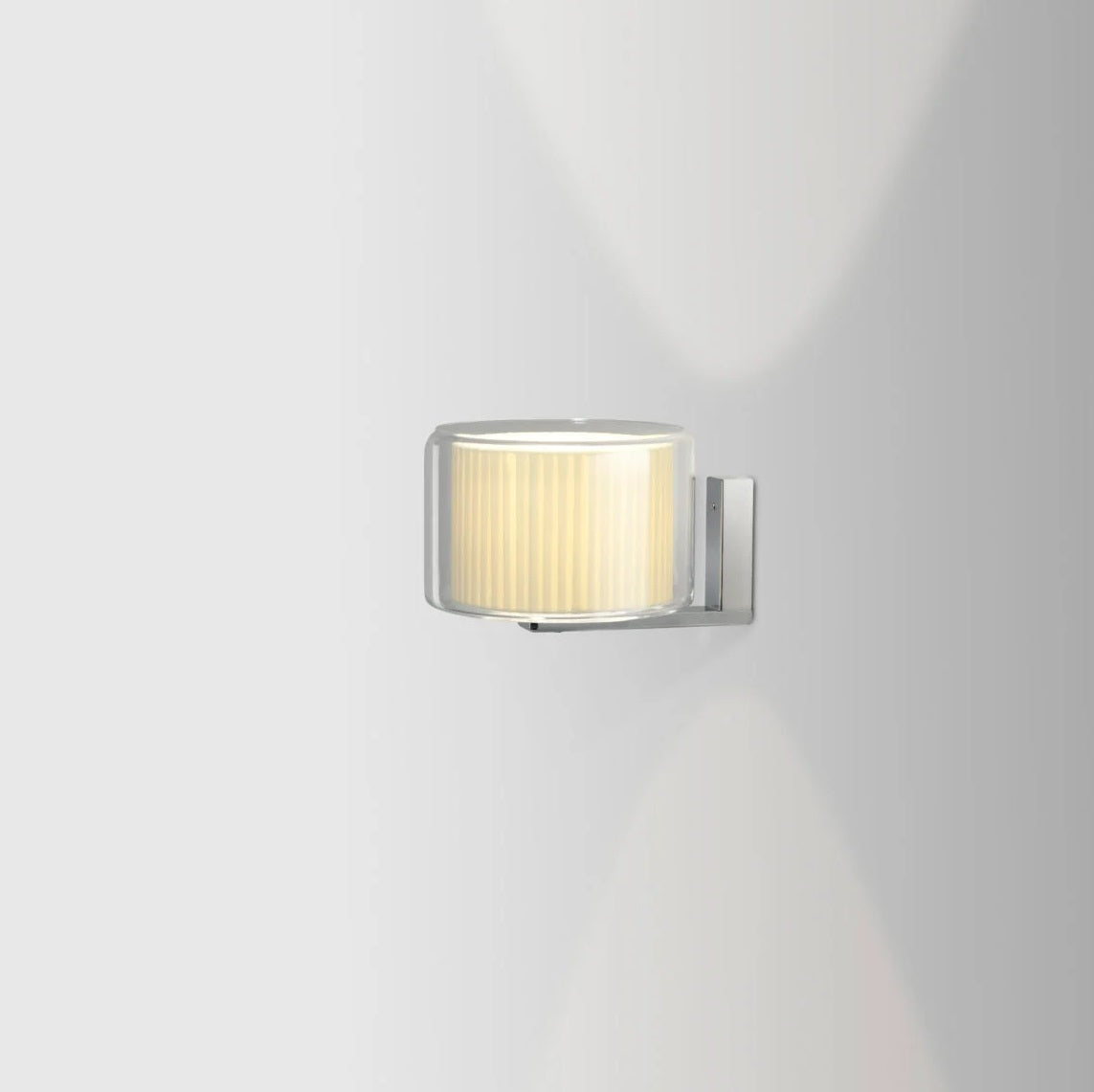 Det gennemsigtige glas omgiver tekstilskærmen, der ligner den svæver, som giver en følelse af luftighed og sofistikering.