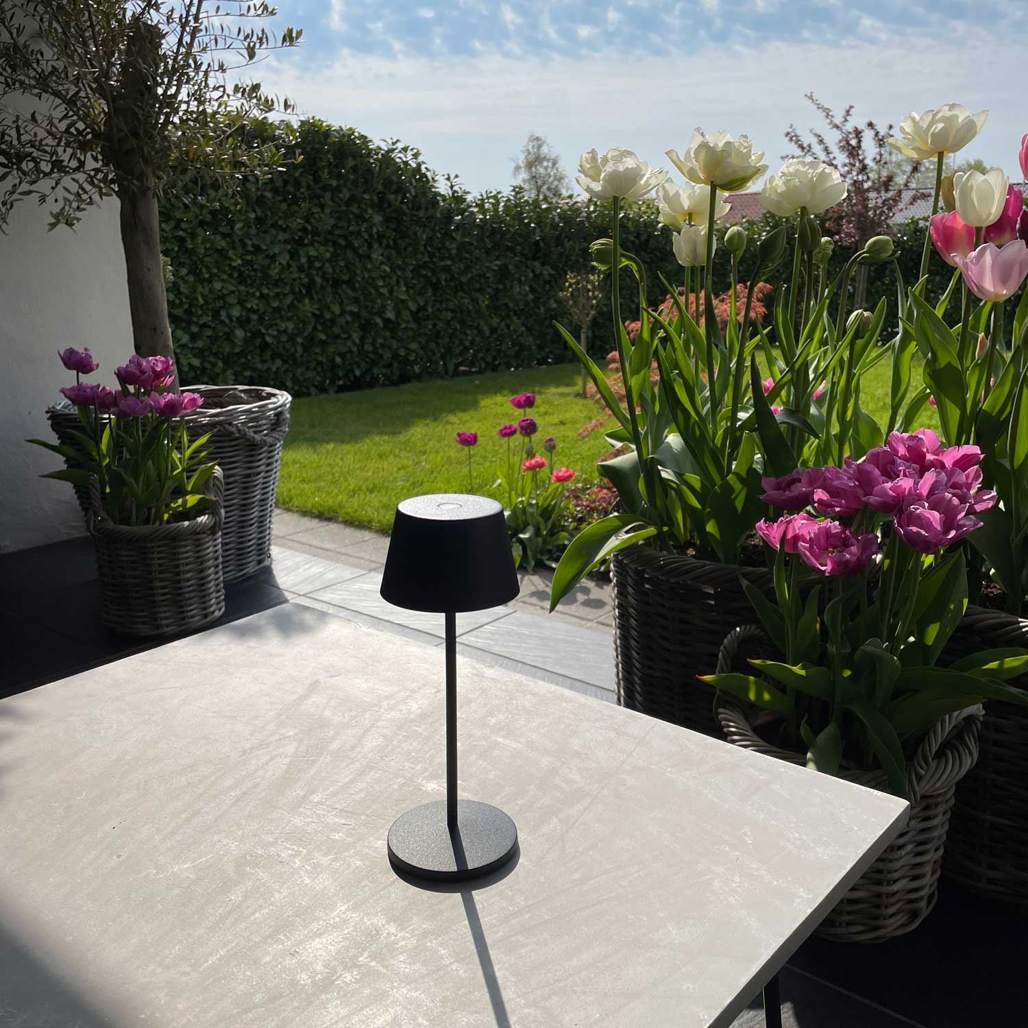 Lampen drives ved et opladelig batteri og med LED lyskilde med lyset dæmpes let med finger touch
