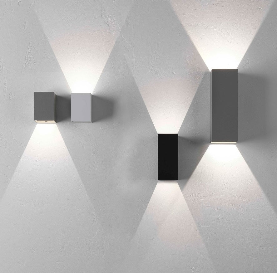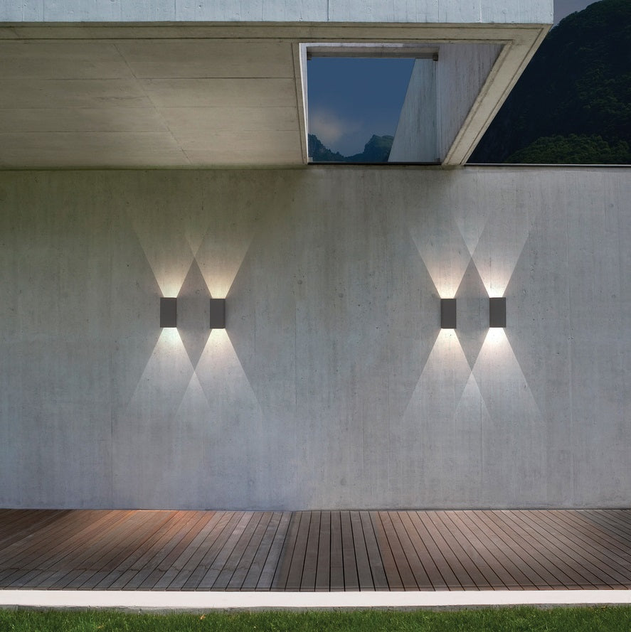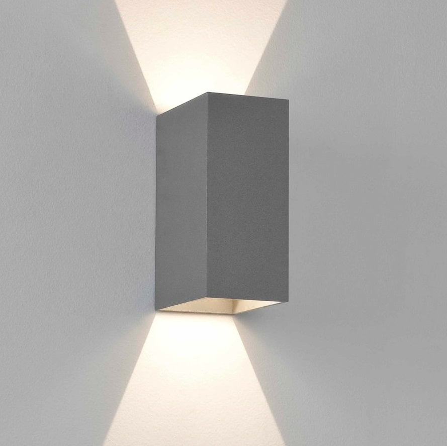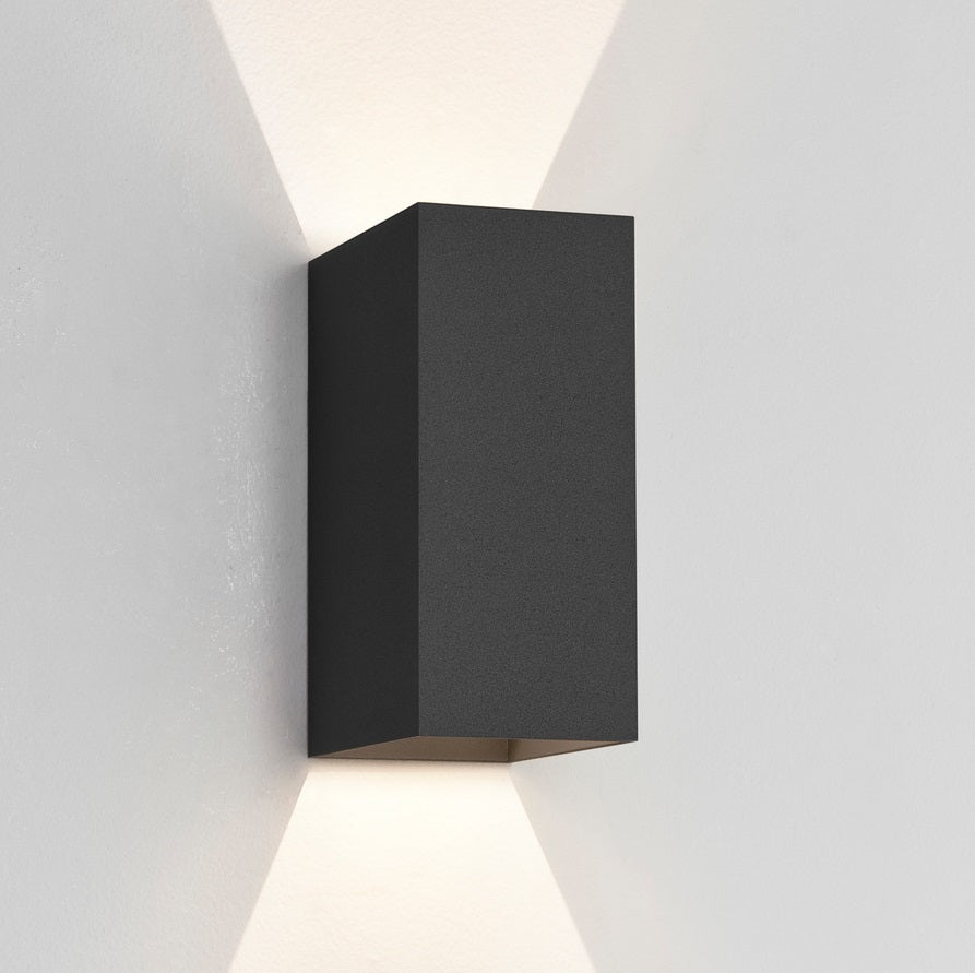 En udendørs kvadratisk væglampe, der er bestående af metal.