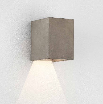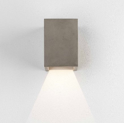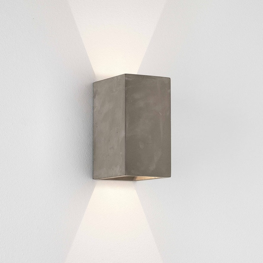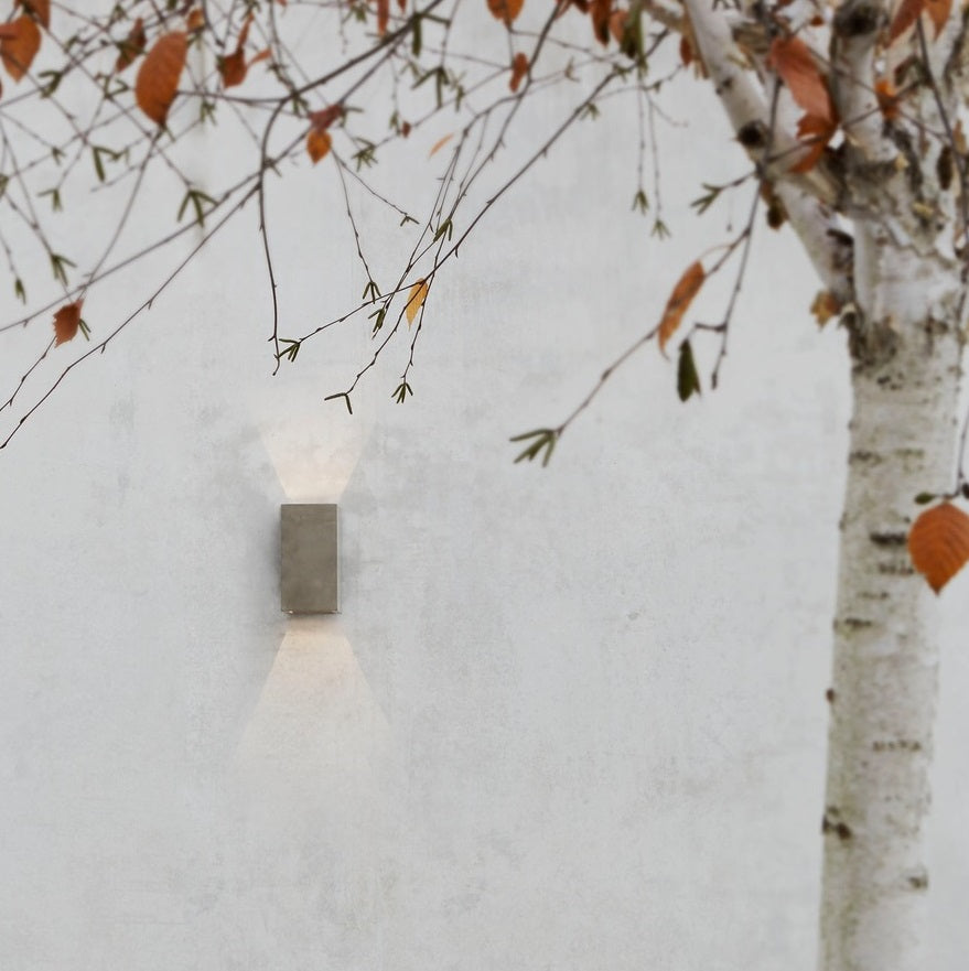 En udendørs kvadratisk væglampe, der er bestående af en kombination af beton, der er tilsat vandtætte tilsætningsstoffer.