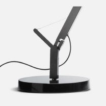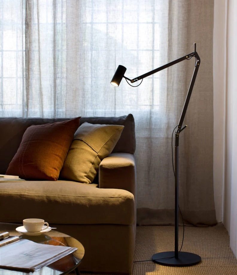Gulvlampen har en krop i lakeret aluminium, der kan justeres, og ovenpå dets lampe hoved har den en drejeknap, hvor man kan justere lysstrålen.