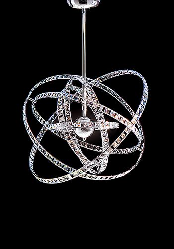 Designer: C.R.M. Beskrivelse: Lette og elegante chrom ringe fyldt med ægte krystaller i et mix af klare og farvede krystaller giver et flot lysspil i denne utraditionelle og ekstravagante lampe. Monteret på teleskopstang i chrom.