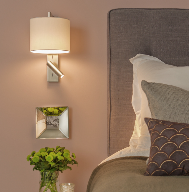 Væglampen har en ekstra indbygget lampe med LED-lys, som er ideel til brug som læselampe.