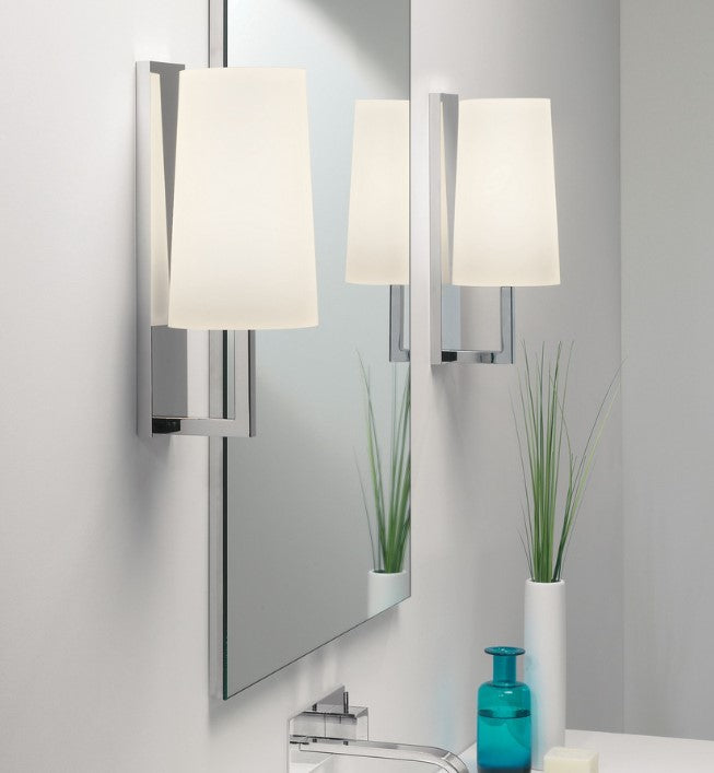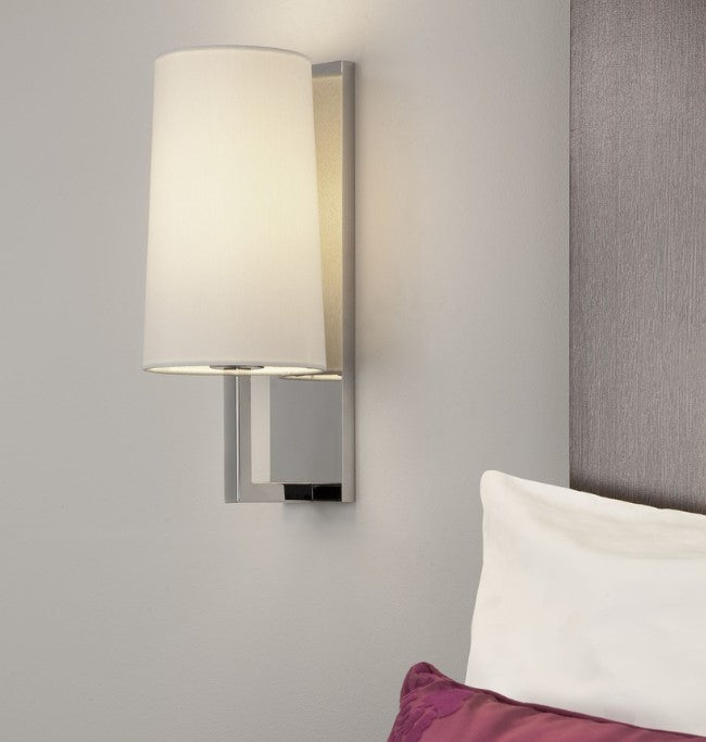 Stellet på væglampen fås i farverne: Poleret krom, mat nikkel, bronze eller mat sort.