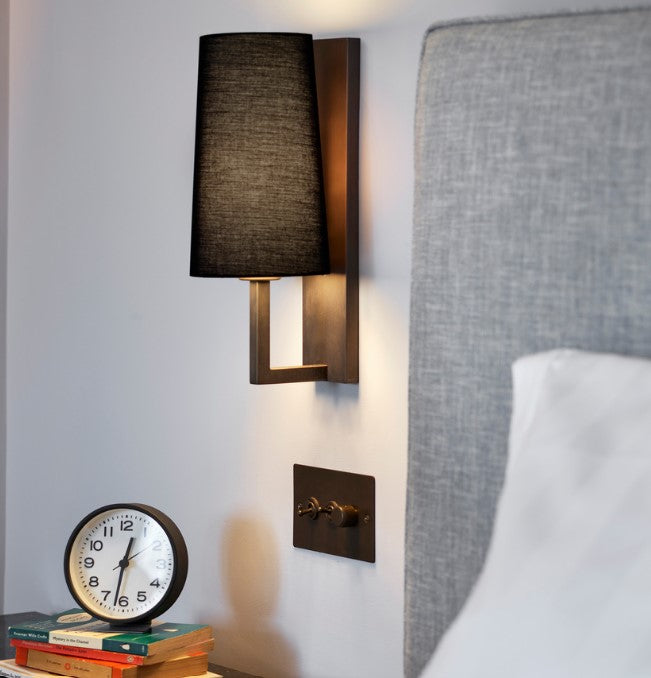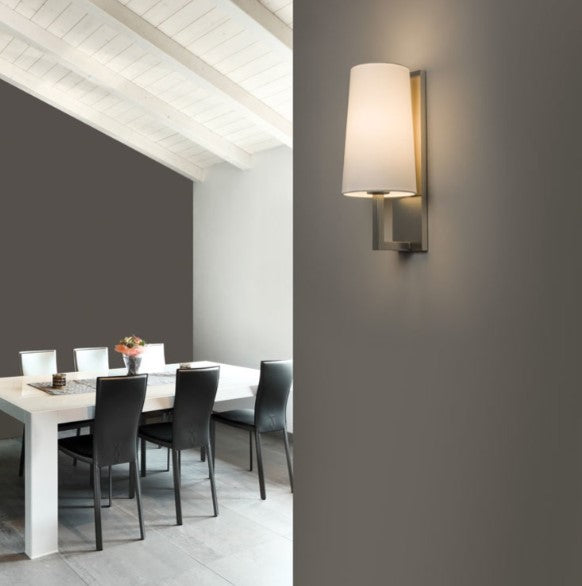 En elegant væglampe, der enten kan fås med en glasskærm eller en stofskærm.
