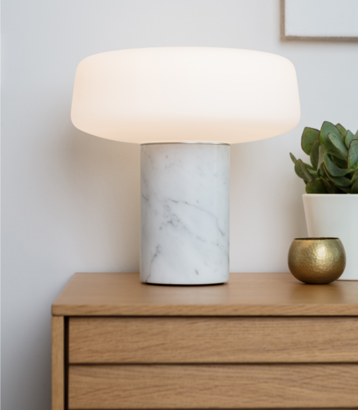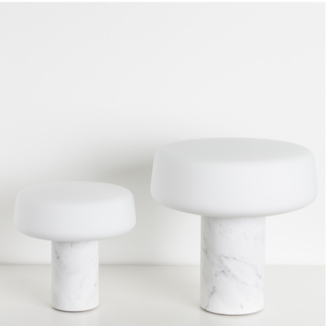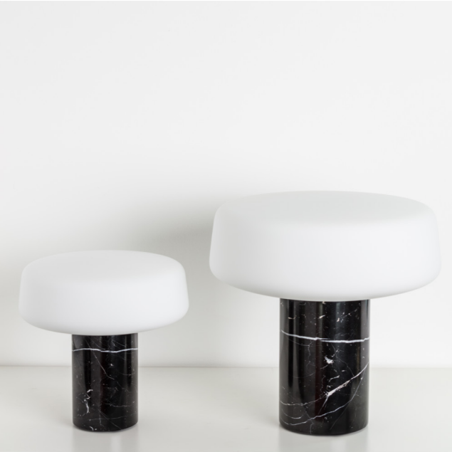 Der er sort, hvid eller grøn marmor fod og den er toppet med en opal hvid skærm.