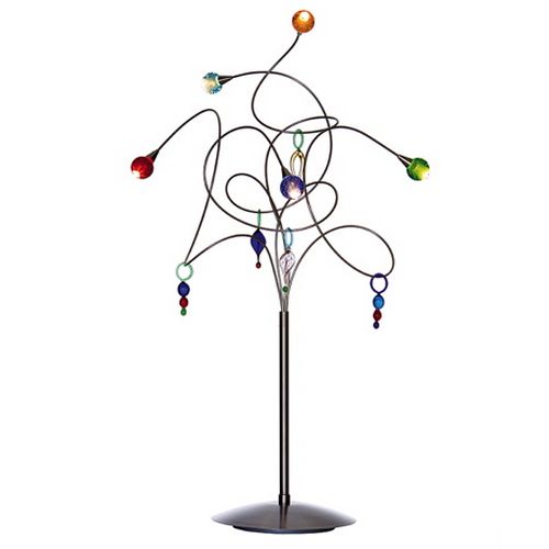 Designer: Harco Loor. Bordlampe i materiale rustfritstål, med lysdæmper. Lyskilde max 5 x 10W G4 12/230V Højde 70 cm Farverne på glasset fås i farve: transperant, rosarød, lyseblå, mørkeblå, turkise, grøn og amber. Levering: 1 - 2 uger.