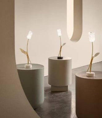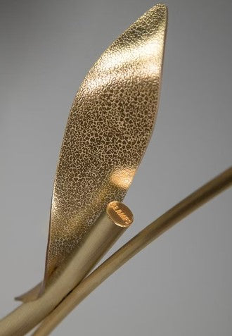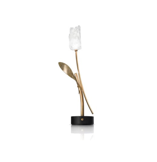 Bordlampen har en anodiseret aluminium stilk, med et kostbart guld cracklé blad på siden, og fås med 2 baser: hvid finish eller sort finish.