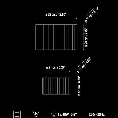- Bredde 32 cm, højde 20 cm, dybde 12 cm, fatning 1 x E27 max. 9W