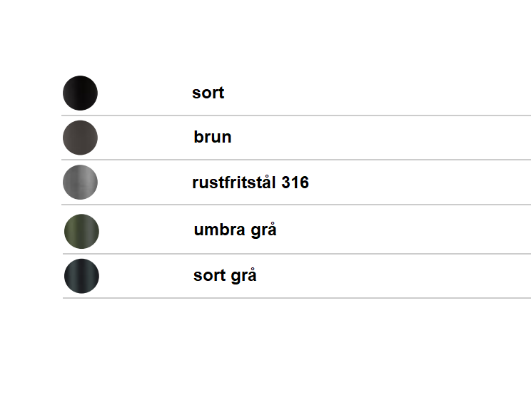 Farven på lampen kan være pulverlakeret sort, sort brun, grå, umbra grå eller 316 rustfrit stål, som bruges på skibe.